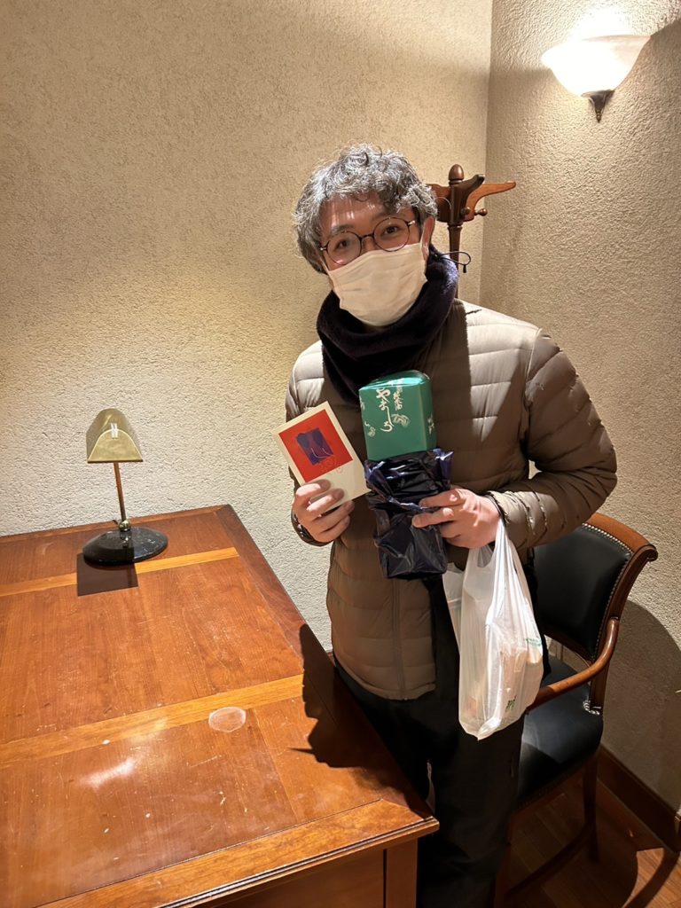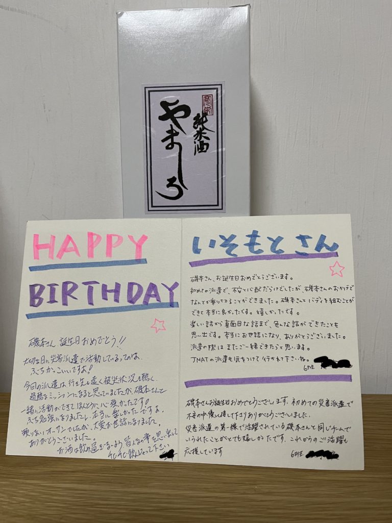 私ごとですが、災害支援ナースの派遣最終日に45歳の誕生日を迎えました。支援が終わって、雪が降る中、後泊のホテルに到着した際にメンバーの皆様から、サプライズでメッセージカードとプレゼントをいただいてしまいました。本当に感謝しかありませんし、色々な意味で思い出に残る誕生日になりました。メッセージカードを見ながら、私も少しは役に立てたんだ、嫌われてはなかったようだ、なんて思うと共に支援終了の安心感もあったからでしょうか、少し涙してしまいました。いただいたお酒は、通常の生活に戻ってからゆっくり晩酌で利用させてもらって飲み干しました。