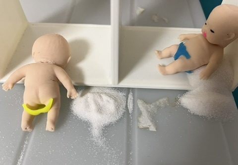 最近涼しくなってきましたが、まだ日中の暑さは続いてますよね。あれは、まだとても暑い日でした。自分の部屋に戻り、さて資料でも作ろうか、と思って後ろの本棚を見ると、プラスチックのブックスタンドに飾っていた、アグリーベイビー(一時期流行った?ガチャのハズレ枠で二体ゲットしていたやつを座らせたりしてた)が、悲惨な状態で倒れていました。多分、熱で暴発したのかな。パンツまで熱で破れてて。そんなことが起こるくらいだから、冷房などがなかったら、そりゃ熱中症になりますよね。