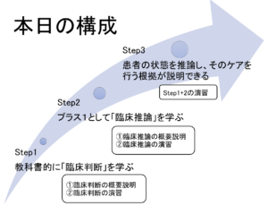 臨床判断は今年度からカリキュラムに入った教科目のため、ラバスの目的・目標が達成できるために手探りの中で講義資料を作成しました。