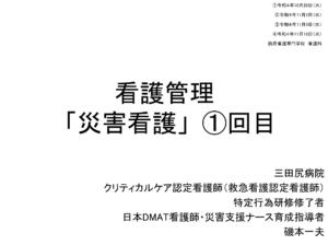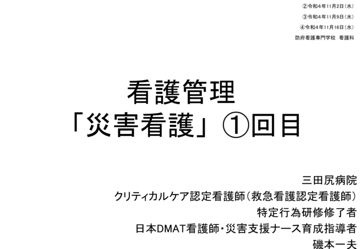 2022年10月26日、11月2日、9日、16日に防府看護専門学校で「災害看護」の講義依頼を受けました。