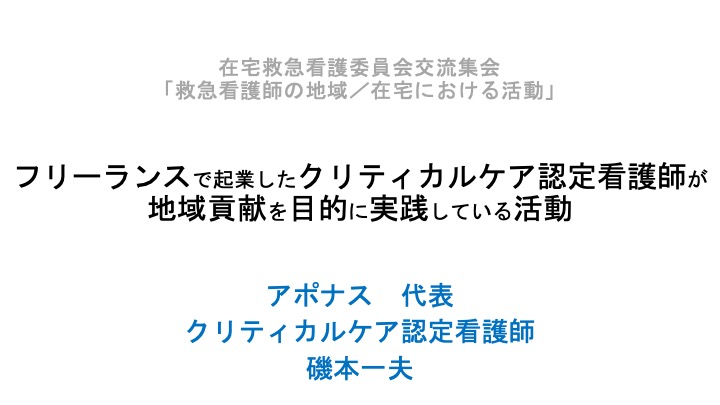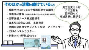 2023年11月24・25日に開催された、日本救急看護学会学術集会の交流集会で今の私の活動についてお話しさせていただく機会をいただきました。現在の自分の活動を報告して、認定看護師が何を見据えて地域に出たのか、地域に出て思うことを共有してもらい、これからの看護活動の参考にしていただければという思いでお話しさせていただきました。聴講してくれたた友人からは、「面白かった。いいものを見せてもらった。」と、褒めているのかディスっているのか分からない評価を受けたりしましたが、面白くないよりはいいかと自分を納得させました。学会のオンデマンド配信で、改めて自分の発表を聞いてみましたが、もっと学術的に伝えられることがあったのだろうと反省しかない内容でした。